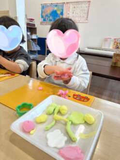 今日のモンテでは、3月のひな祭りのお飾りを紙粘土で作りました。
