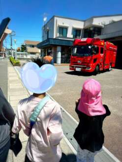 消防車に乗せて貰い、子供たちは大喜びでした。