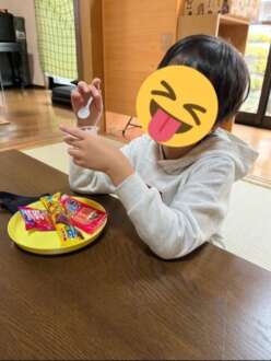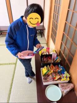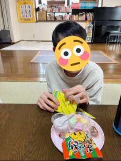 計算しながら、おやつを選んでいます。計算機を使う人、選んでから計算してもらう人、食べる時はみんな笑顔です。