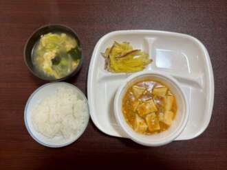 ごはん、麻婆豆腐、さつまいもの天ぷら、中華スープ。美味しい!!と、あっという間に完食でした。