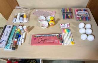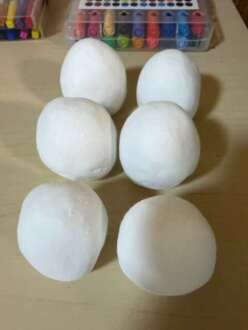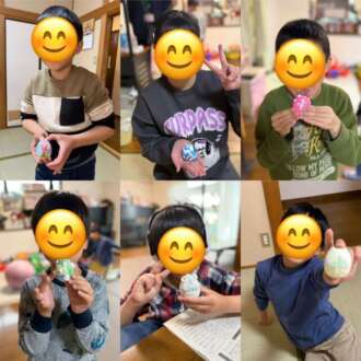 準備された卵型の紙粘土に様々な画材などを使って、着色や装飾をしています